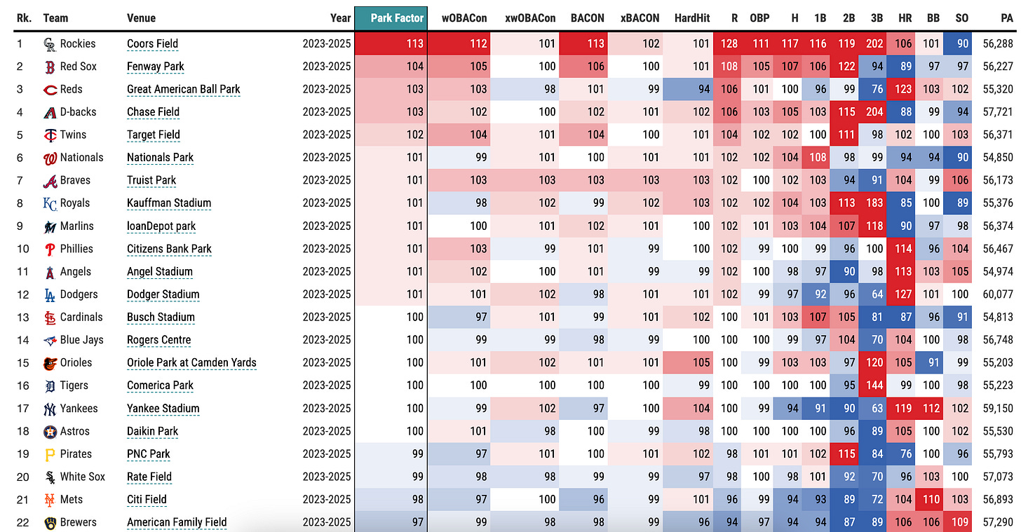 Collins surprised me somewhat, as I expected to see a lower power projection based on some of the underlying data from a year ago. He finished last season with plenty of red flags, including a 14th percentile xSLG and 17th percentile Barrel rate. However, Collins has slightly above-average bat speed and makes a lot of contact. Digging deeper, it felt important to compare the ballpark in Milwaukee to where Collins will play half of his games in 2026. How will the change of scenery impact things? In most cases, Kauffman has historically been seen as a limitation to production. We saw it with Jonathan India leaving Great American Ballpark. This time around, however, I’m not sure we will see the same impact.